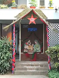 In addition to traditional Christmas decorations, it is common among Uruguayan Christians to put up a balcony banner with an illustration of the nativity scene that reads "Christmas with Jesus".[46] These banners were launched in 2016 as part of a campaign carried out by the Catholic Church in Uruguay to "raise awareness about the true meaning of the holiday" in a highly secular country.[47] Pope Francis welcomed the initiative and was photographed with one in the Vatican City.[48]