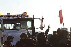 Protesters block a truck trying to enter Terminal 5 of the Port of Portland