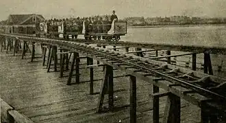 The Ocean Pier at Atlantic City was extended by 500 feet (150 m) in 1896/97. At the same time it was widened, and the railway, a fishing platform and several pavilions were built. The gauge of the railway was 2 ft 9 in (838 mm). At the shore loop the distance between the inner rails was 30 feet (9.14 m), which necessitated a very sharp curve. The loop at the ocean end was broader and permitted a curve with 60 feet (18.3 m) diameter. The power station was located at the inner end of the pier. Mr Young and Mr McShea were the builders and operated the railway line. The scenic ride and view of the city made the railroad popular with the summer visitors.[1]
