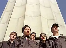 Once in New York, the Oddjobs crew moved into a shared house[24] in Fort Greene, a neighborhood in Brooklyn.[25] They signed with indie label Third Earth Records and Caroline Distribution, boosting their marketing and commercial reach.[10][7] In advance of their second full-length album, 2002's Drums, Oddjobs released two singles. The first, "Blue Collar Holler," was described by Crescent Moon as "our sort of calling-card party track, the ear candy that will get you to taste the rest of the album."[9] Reggie Royston of the St. Paul Pioneer Press called it "the group's anthem, marrying '70s organ funk with a clowning, jump-up rap intensity reminiscent of early '90s crews like the Pharcyde."[10] "Blue Collar Holler" reached No. 6 on the Hip-Hop singles chart of CMJ New Music Monthly in July 2002.[26][27] It was also named one of the top Minnesota-made songs of 2002 in a Star Tribune poll of Twin Cities critics.[28] A second single, "Dry Bones", featured a remix with Aesop Rock, Vast Aire of Cannibal Ox, and Kimani of Masterminds.[19][1][29]