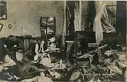 After shots from surrounding buildings killed a young boy carrying an icon, the pogrom erupted. Although the perpetrators remain uncertain, revolutionaries or members of Jewish and student self-defense brigades are thought to have fired shots and reportedly threw homemade bombs, triggering a panic. The patriotic crowd, convinced that Jews were responsible, began shouting "Beat the Kikes" and "Death to the Kikes," kicking off a violent rampage. The pogrom escalated as people fired more shots from rooftops and balconies, and after Jewish self-defense brigades fired on Russians holding smaller processions encountered similar pogromist reactions. The violence raged until October 22. This pogrom became the most destructive anti-Jewish incident in Russian history at the time, exceeding the 1881-1882 pogrom wave. The attackers committed atrocities including brutally beating, mutilating, and murdering defenseless Jewish people, threw Jews out of windows, raping women and slaughtering infants in front of their families.[10] The rioters killed pregnant women giving birth along with their midwives in a maternity hospital and attempted to rape others. A little under 10% of the deaths were women, four of whom were among the self-defense brigades.[60]