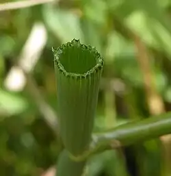 Tubular water-dropwort is a hairless, stoloniferous perennial growing up to 80 cm tall with brittle, hollow, inflated cylindrical stems 0.5 cm in diameter, which are constricted at the nodes (hence the specific name fistulosa). Unlike some other water-dropworts, it has no swollen tubers among the roots, but it can reproduce vegetatively by the lengthy stolons.[1]