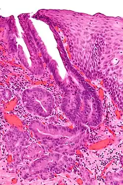 There are several established risk factors for OGJ adenocarcinoma. The biggest risk factors include gastroesophageal reflux disease (GERD) and Barrett's oesophagus. Other risk factors include smoking (with a twofold-increase) and obesity.[3]