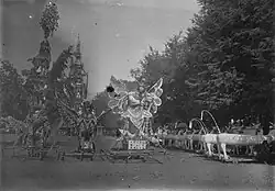 The ogoh-ogoh tradition, as it is known today, is considered a relatively new cultural practice[6] and does not originate from ancient Balinese times,[7] though it has roots and inspiration from older traditions. The practice of creating giant statues for public processions existed before the modern ogoh-ogoh tradition. However, before the 1980s, these statues were not known by the term ogoh-ogoh, nor were they paraded for the Pangrupukan procession (the day before Nyepi). Instead, they were used in grand cremation ceremonies (pelebon) that featured Bade Awin or Pengabenan Mawangun.[8] These ceremonies were organized by noble families of the puri (royal courts). Such statues could also be made for the cremation of Hindu priests. A historic video recorded by Canadian composer Colin McPhee captures several statues being paraded during a pelebon in Gianyar in 1933.[9] According to cultural expert Anom Ranuara, the statues accompanying these cremations served as inspiration for modern ogoh-ogoh.[8]