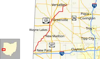 State Route 121 (SR 121) is a state highway in western Ohio. It starts at Indiana State Road 121 near New Paris, Ohio, and ends at State Route 47 and State Route 185 in Versailles, Ohio.
