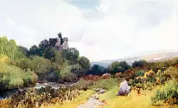 In the 18th century, the castle became a popular topic for painters interested in the then fashionable landscape styles of the Sublime and the Picturesque. Richard Wilson painted the castle in 1771, dramatically silhouetting the keep against the sky, producing what historian Jeremy Black describes as a "calm, entranching and melancholic" effect.[30] Thomas Walmesley's rendition went further, depicting Oakhampton Castle surrounded by an imaginary, Italianate lake in 1810.[31] Thomas Girtin painted the castle in 1797, as did his friend J. M. W. Turner in 1824.[32] Sir Vyell Vyvyan conducted some minor repairs to the castle during the 19th century.[33]