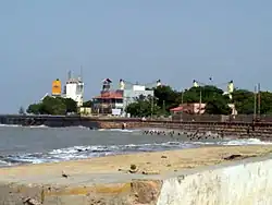Bet Dwarka, an island in the Arabian Sea off the coast of Dwarka. Considered the original residence of Krishna, Bet Dwarka was the old port during the ancient times of Krishna before the Okha port was developed in Dwarka. The temple built here is credited to the religious Guru Vallabhacharya of the "Pushtimarg Sampradaya". Rice is the traditional offering here to the deity as it is believed that Sudama offered rice to his childhood friend Krishna. There are also smaller shrines on Bet Dwarka which are dedicated to Shiva, Vishnu, Hanuman and Devi.[42] According to a legend, Vishnu killed the demon Shankhasura on this island. There are temples of Vishnu in the incarnation of matsya, or fish. Other shrines here are of Rukmini, Trivikrama, Devaki, Radha, Lakshmi, Satyabhama, Jambavati, Lakshmi Narayan, and many other gods.[39]. Hanuman Dandi temple is another notable temple located in Bet Dwarka, 6 kilometers (3.7 mi) away from Dhwarkadhish Temple, Bet Dwarka. The temple is deified with many images of Hanuman and his son Makardhwaja. The legend associated with the birth of a son to Hanuman, who is considered celibate, is that the sweat of Hanuman was consumed by a crocodile which then gave birth to a son named Makardhwaja.[42] The Jethwa Rajput clan of Kshatriyas claim their descent from Makardhwaja.