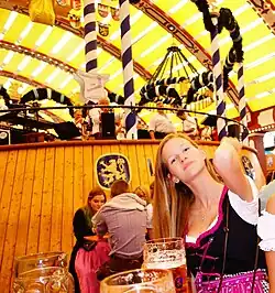 The Hanover Oktoberfest is a fair that takes place every year at the end of September or at the beginning of October.[54] It usually lasts 17 days and features 140 rides and booths, two large beer tents seating more than a thousand people each, and numerous stands, beer gardens and five small beer tents offering food and refreshments. The program consists of a dirndl competition, three fireworks, two family days, a hand lantern parade for kids and a backstage tour. You can get a special festival-beer from the local brewery Herrenhäuser Brewery, the Lüttje Lage (an alcoholic speciality of Hannover) and many foods from Lower Saxony and Bavaria. With around one million visitors each year, it is the second-largest Oktoberfest in Germany.