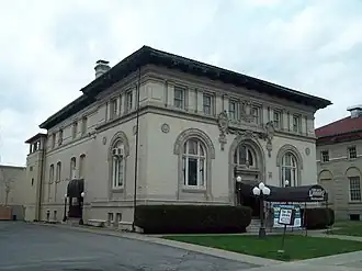 The library is a historic, built in 1909, with funds provided by the philanthropist Andrew Carnegie was one of 3,000 such libraries constructed between 1885 and 1919, and one of 107 in New York State. Carnegie provided $40,000 (equivalent to $1,400,000 in 2024) toward the construction of the Olean library. The building was designed by architect Edward L. Tilton in the Beaux-Arts style. The interior features a grand stairway and entrance, large rooms, and central atrium.[5] The Carnegie building was opened May 23, 1910 and a period of growth in the size and scope of the collection and patronage began almost immediately. It was listed on the National Register of Historic Places in 1985.[1]