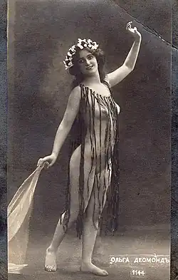The "heroine of living pictures", Olga Desmond became one of the first to promote nudity on the stage in St. Petersburg, Russia, when in the summer of 1908, the German dancer arrived there with her repertoire of performance. Olga Desmond's Evenings of Beauty quickly became the subject of a great debate in the Russian media. At least one of the representatives of official "justice" wanted to haul Desmond into court for "seduction".[11]