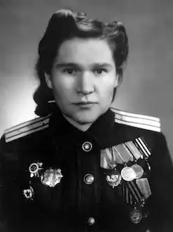 Olga Mitrofanovna Sholokhova (Russian: Ольга Митрофановна Шолохова; 19 July 1915 – 1 February 2001) was a deputy squadron commander in the 125th Guards Bomber Aviation Regiment and one of only nine women awarded the Order of Alexander Nevsky.