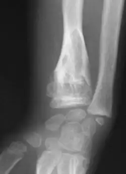 X-ray image showing enchondromas localized in the lower part of the radius of a 7-year-old girl with Ollier disease.