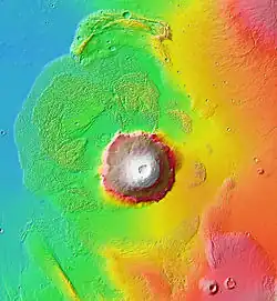 Colorized topographic map of Olympus Mons and its surrounding aureole, from the MOLA instrument of Mars Global Surveyor