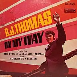 On My Way is a studio album by B. J. Thomas via Scepter Records.[1] Released in 1968, the album contained two singles: "The Eyes of a New York Woman" (which reached No. 28 in the U.S. and No. 29 in Canada) and "Hooked on a Feeling" (which peaked at No. 5 in the U.S. and No. 3 in Canada).[2] Also included on the album are covers of "Four Walls" (originally by Jim Reeves), "Light My Fire" (originally by the Doors) and "Mr. Businessman" (originally by Ray Stevens).