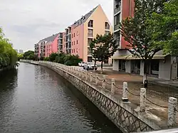 Gaoqiao New Town is influenced by the design of Dutch port cities like Rotterdam.[1]: 154  Its architectural features include brightly coloured stucco facades, pitched roofs, and Dutch gables.[1]: 154  Public spaces include Netherlands-style features like canals, plazas, windmills, and a drawbridge.[1]: 154