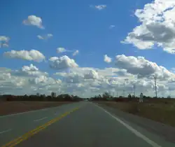 Highway 140 begins at an intersection with Highway 3 on the eastern edge of Port Colborne. From there, Highway 3 continues east to Fort Erie; to the west it becomes Niagara Regional Road 3.[3] The roadway carrying Highway 140 continues south of Highway 3 as a local road named Elizabeth Street, whereas Highway 140 travels north, to the west of forestland and a quarry. The highway parallels the Welland Canal throughout its length, always within 2 kilometres (1.2 mi) of the waterway.[4][5] Wooden high-tension powerlines parallel the highway until it diverges, curving towards the northeast immediately north of Chippawa Road. It travels diagonally for several kilometres before ascending on an overpass and crossing the former Canadian National Humberstone Subdivision tracks.[6]