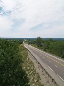 Highway 26 between Owen Sound and Meaford in the west is not as highly travelled as the tourist areas to the east.[1] From Meaford eastwards, the highway runs along the Georgian Bay shoreline, and in The Blue Mountains, extending from Thornbury eastwards through to the west limits of Collingwood. It passes through a nearly continuous corridor of low-density resort-style residential developments, mostly concentrated in the Blue Mountain Resort area. Between Collingwood and Wasaga Beach, the highway is a four-lane divided roadway with roundabouts transitioning to the undivided sections at both ends: one at Mosely Street in Wasaga Beach, and the other at Poplar Sideroad in Collingwood.[4]