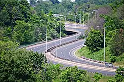 On May 15 2009, Minister of Transportation Jim Bradley announced that the section from Port Robinson road to East Main Street in Welland would be converted to a full freeway;[26] this work included a roundabout at East Main Street to replace the existing signalized intersection.[27] Work on the Merritt Road overpass began in September 2009,[9] and was scheduled for completion in mid-2011.[28] On August 19, 2011, full construction began with a groundbreaking ceremony.[29] The roundabout with East Main Street opened to traffic on September 5, 2013, featuring no central island. The existing signalized junction at Woodlawn Road was repurposed for the southbound off-ramp and on-ramp, as continuous Highway 406 traffic was rerouted upon new overpasses. By September 2015, all the at-grade intersections had been removed and Highway 406 was a minimum four-lane, controlled-access freeway for its entire length.[30] Despite requests from local politicians, there are no plans to extend Highway 406 to Port Colborne at this time.[27]
