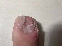 Onychotillomania is a compulsive behavior in which a person picks constantly at the nails or tries to tear them off.[1] It is not the same as onychophagia, where the nails are bitten or chewed, or dermatillomania, where skin is bitten or scratched. Onychotillomania can be categorized as a body-focused repetitive behavior in the DSM-5 and is a form of skin picking, also known as excoriation disorder.