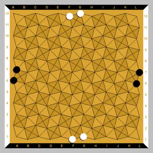 The Onyx board is a grid of interlocking squares and triangles, with pieces played on the points of intersection (as in Go). Each side of the board comprises twelve points. Black tries to connect the two horizontal (black) sides with an unbroken chain of black pieces, while White tries to connect the two vertical (white) sides with an unbroken chain of white pieces. The first to do so wins the game.
