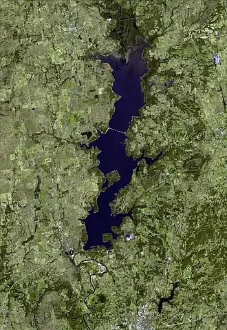 Lake Oologah is a reservoir in northeastern Oklahoma. It is located near the towns of Oologah, Nowata, and Claremore. The lake has a surface of 29,500 acres (119 km2) of water and 209 miles (336 km) of shoreline with 11 lake-side parks. The water storage capacity is rated as 552,210 acre-feet (681,140,000 m3).[2] The lake is formed along the Verdigris River, and is a source of water for the Tulsa Metropolitan Area. The purpose of the dam and lake is flood control, water supply, navigation, recreation, and fish and wildlife.