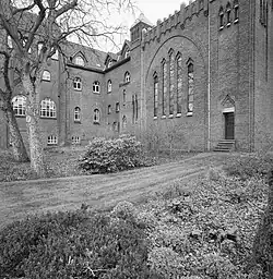 St. Paul's Abbey was founded by monks from Wisques Abbey in Wisques in the Pas-de-Calais who were forced to leave France by the anticlerical policies and popular feeling of the period. The community settled initially in Belgium, at first in Honnay and later in Montignies-Saint-Christophe.[1] The Benedictine nuns of Wisques had already settled in Oosterhout in the Onze-Lieve-Vrouweabdij (Abbey of Our Lady, Oosterhout) and the abbot of Solesmes wanted both communities close to each other in the same town. The monks therefore bought 2 hectares of land nearby but had difficulties with the Dutch architect who was working for the nuns.[2] Eventually the new priory was built under the supervision of the architect Dom Bellot, and proved to be a masterpiece of brick architecture, as well as the architect's first great work.[3] The building was finished in 1907 and the community was raised to the status of an abbey in 1910. Dom Jean de Puniet was the first abbot.[4]