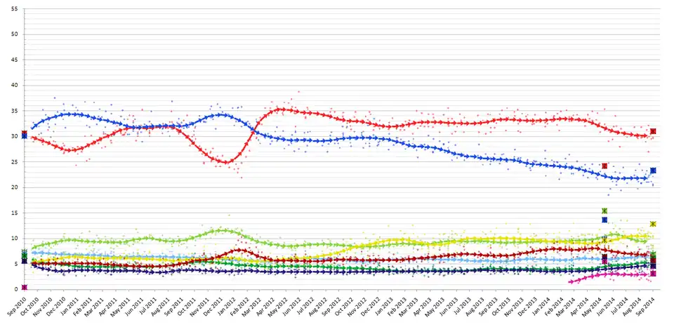 | 14 Sep 2014 | General Election | 31.0 | 23.3 | 6.9 | 5.4 | 6.1 | 12.9 | 5.7 | 4.6 | 3.1 | 1.0 | 7.7 |