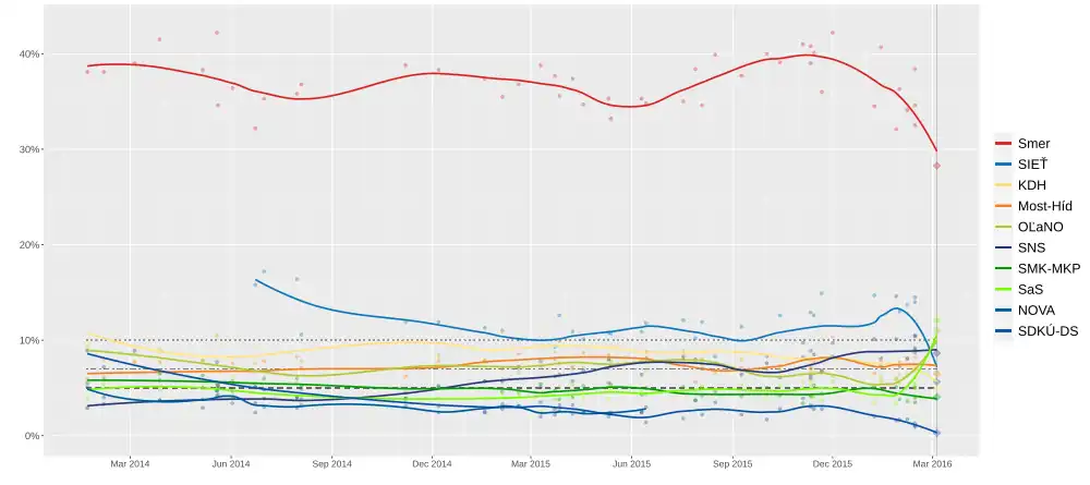 - ^ "Prieskum: Do parlamentu by sa dostalo päť strán, voľby by vyhral Smer". 30 November 2015.