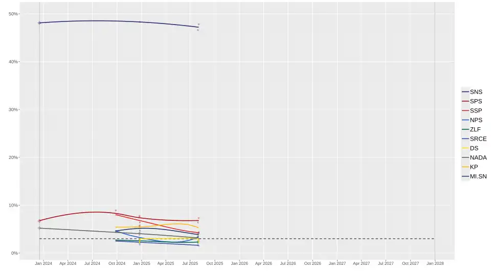 | NSPM[8] | 24 July 2025 | 1,100 | 40.2 | 23.5 | 3.6 | 4.5[h] | 1.2[i] | 1.5 | 2.7 | 2.5 | 2.8 | 18.9[j] | 16.7 | |||