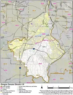 District 19 of the Oregon State Senate comprises northwestern Clackamas, southwestern Multnomah, and southeastern Washington counties and includes Lake Oswego, Tualatin, and West Linn as well as Portland's South Waterfront. It is composed of Oregon House districts 37 and 38. It is currently represented by Democrat Rob Wagner of Lake Oswego.