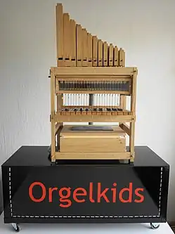 An organ in a lesson box is a unique concept, first conceived and built by Dutch organ builder Wim Janssen specially for the goal of educating children with the technology and playing of the organ. It is not a demonstration organ with just a few keys, but a real instrument with which children can self-discover how it works. That is the reason it was given the name, "Do-organ." The Orgelkids instrument is a mechanical, tracker organ with two octaves (24 keys) and two registers which can be used independently or in combination. Air (wind in organ parlance) is supplied by a hand-pumped bellows.[3]