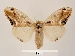 The wingspan is 21–29 mm for males and 30–42 mm for females of the first two generations.[2]