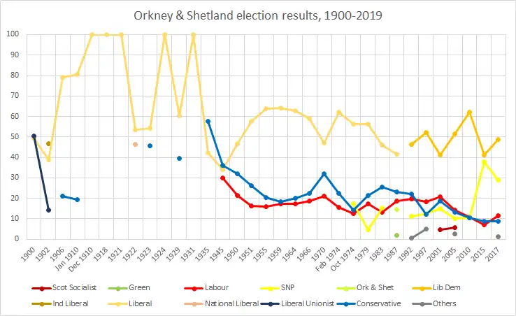 The constituency has elected only Liberal and Liberal Democrat MPs since 1950; the longest run of any British parliamentary constituency.[12][13] At each general election from 1955 until 1979, in 1987, 2010 and again in 2017 it was the safest Liberal Democrat seat in the UK. At the 2015 general election, it was the only seat in Scotland to return a Liberal Democrat MP.