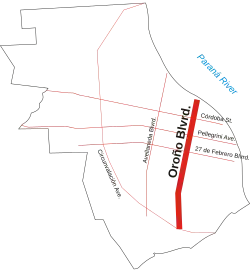 Oroño Boulevard (in Spanish, Bulevar Oroño) is a street in Rosario, Santa Fe Province, Argentina. It is a two-way boulevard that runs north–south through the center-east of the city, from the coastal avenue by the Paraná River to the southern limit of the urbanized area. Together with the river and Pellegrini Avenue, it also marks the unofficial limit of the downtown area.
