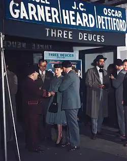 In 1942, Pettiford joined the Charlie Barnet band and in 1943 gained wider public attention after recording with Coleman Hawkins on his "The Man I Love".[1] Pettiford also recorded with Earl Hines and Ben Webster around this time.[1] After he moved to New York, he was one of the musicians (together with Dizzy Gillespie, Thelonious Monk, Kenny Clarke) who in the early 1940s jammed at Minton's Playhouse, where the music style developed that was later called bebop.[1] Pettiford and Dizzy Gillespie led a bop group in 1943.[1] In 1945, Pettiford went with Hawkins to California, where he appeared in The Crimson Canary, a mystery movie known for its jazz soundtrack, which also featured Josh White. He then worked with Duke Ellington from 1945 to 1948 and for Woody Herman in 1949, before working mainly as a leader in the 1950s.[1]