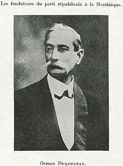 Between 1890 and 1898, the Republican party, which had been very united until then, experienced a split between its two main figures, Marius Hurard and Ernest Deproge. Duquesnay became closer to the Hurardists and the Békés, or white Creole landowners, who gradually returned to the political arena.[4] One of the consequences of this change of camp was the defeat of Osman Duquesnay in the 1898 municipal elections in Fort-de-France by the Hurardist candidate, Henri Audemar. Despite his defeat in the municipal elections, Osman Duquesnay remained politically active and ambitious. In 1898, Osman Duquesnay ran against his former party friend Ernest Deproge in the legislative elections and inflicted a crushing defeat on him. In the Chamber of Deputies in Paris, he acted in concert with Jean Guibert, for example in protesting bloodshed during strikebreaking in 1900.[5]