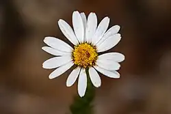 This shrublet grows up to 40 cm (16 in) tall and is densely covered in oval-shaped leaves. The leaves are reflexed (bent downwards) and toothed. They are 4–10 mm (0.16–0.39 in) long.[3] Flowers are present between September and February.[4] The flower heads are radiate and solitary. They are yellow with white rays.[3] The pappus (a modified calyx that surround the individual floret) is absent.[4]
