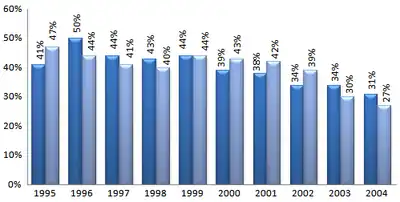 Osteopathic physicians have historically entered primary care fields at a higher rate than their MD counterparts. Some osteopathic organizations make claims to a greater emphasis on the importance of primary care within osteopathic medicine. However, the proportion of osteopathic students choosing primary care fields, like that of their MD peers, is declining.[65] Currently, only one in five osteopathic medical students enters a family medicine residency (the largest primary care field).[66] In 2004, only 32% of osteopathic seniors planned careers in any primary care field; this percentage was down from a peak in 1996 of more than 50%.[64]