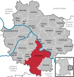 Osterhofen (German pronunciation: [oːstɐˈhoːfn̩] ) is a town in the district of Deggendorf, in Bavaria, Germany. It is situated on the right bank of the Danube, 16 km south of Deggendorf.
