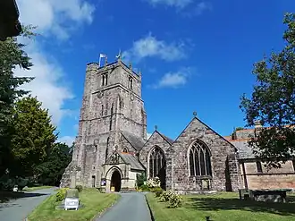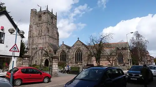 St Oswald's Church was first mentioned in the 1086 Domesday Book and a tithe document in Shrewsbury the same year.[53] St Oswald's Church is Grade II* listed, having a tower dating from late 12th or early 13th century and later additions particularly in the 17th and 19th centuries.[54] There is a new window in the east nave, designed by stained glass artist Jane Gray[55] in 2004.