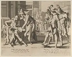 Cambyses II appointing Otanes as judge in place of his flayed father Sisamnes, after a painting by Peter Paul Rubens. The skin of his father appears above the seated Otanes.[3]