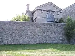 A view of the gallows (doors closed) from within the jail's exercise yard. Note the trap door above the window.