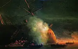 The Ottoman fleet began mobilizing in September 1876 to prepare for a conflict with Russia, as tensions with the country had been growing for several years, an insurrection had begun in Ottoman Bosnia in mid-1875, and Serbia had declared war on the Ottoman Empire in July 1876. The Russo-Turkish War began on 24 April 1877 with a Russian declaration of war.[7] By this time, Asar-i Şevket had been transferred to the I Division in the Mediterranean Fleet, but she was quickly transferred to the Black Sea squadron, with the bulk of the Ottoman ironclad fleet.[8][9] The Ottoman fleet, commanded by Hobart Pasha, was vastly superior to the Russian Black Sea Fleet; the only ironclads the Russians possessed there were Vitse-admiral Popov and Novgorod, circular vessels that had proved to be useless in service. The presence of the fleet did force the Russians to keep two corps in reserve for coastal defense, but the Ottoman high command failed to make use of its naval superiority in a more meaningful way, particularly to hinder the Russian advance into the Balkans. Hobart Pasha took the fleet to the eastern Black Sea, where he was able to make a more aggressive use of it to support the Ottoman forces battling the Russians in the Caucasus. The fleet bombarded Poti and assisted in the defense of Batumi.[10]