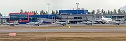 The old terminal of the airport was demolished in 2005 for more apron space and a major extension of the main terminal was completed in September 2011.[5] Four new jetbridge gates (gates 13–16) were constructed and the main terminal was expanded by 4,300 square metres (46,000 sq ft), raising the capacity of the airport to 1.5 million passengers per year. The terminal has three cafes, one before security and two in the gate area which also has a bar "Oluthuone Toppila" and a duty-free shop. There's also a designated smoking area and a grand piano that can be played by visitors.[6]