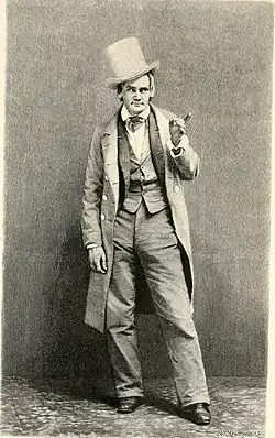 Our American Cousin premiered in New York on 15 October 1858. After several weeks of performances, Sothern began portraying the role more broadly, as a lisping, skipping, eccentric, weak-minded fop prone to nonsensical references to sayings of his "bwother" Sam.[1] His ad-libs were a sensation, earning good notices for his physical comedy and spawning much imitation and mockery in both the United States and England. Sothern gradually expanded the role, adding gags and business until it became the central figure of the play. The most famous scene involved Dundreary reading a letter from his even sillier brother. The play ran for 150 nights, which was very successful for a New York run at the time.[2]