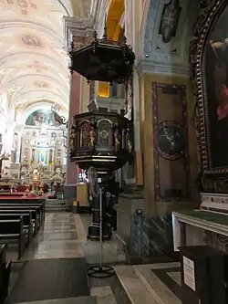 The interior of the church is elaborate, with ten side altars, 28 bronze candelabra, stained glass windows, and a French organ from the 19th century. The wooden pulpits were designed by João Landi, and carved in an elaborate Manueline style. They are a key historical feature of the cathedral; they show elements similar to those of the cathedrals of the Middle Ages and Italian influence. The doors of the sacristies and of the Bishop are carved and gilded in the baroque style. The wall of the anteroom of the Bishop's sacristy has a baroque carving of Our Lady of Bethlehem. The side chapels are dedicated to Our Lady of Grace and the Santíssimo Sacramento. They are likewise in marble and designed in the same neoclassical style of the high altar.[8]