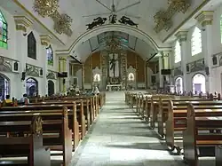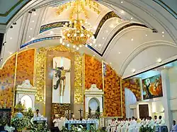 The current altar features a gold-painted bronze statue at the center, depicting a risen Christ with a cross backdrop. This signifies that Christ has triumphed over death, as symbolized by a risen Christ over a cross (interpretation should not be taken out of literal context). The nine-foot tall statue was specially crafted by Sandro Castrillo, a famous sculptor. The altar is flanked by retablos that house the Our Lady on the right and Saint Sebastian on the left. The church also features its old parish logo and maidens offering flowers and fruits installed at the front of the church dome, handcrafted by Philippine National Artist, Napoleon Abueva.
