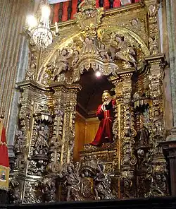 The carving of the chancel, considered the masterpiece of the genre in the period,[8] was made by Francisco Xavier de Brito and executed from 1746 to 1751, that is, until his death.[3] The work includes the Virgin of the Pillar enthroned in a place traditionally reserved for the Eucharist and the coronation is surrounded by several angels and cherubs of different sizes. Solomonic columns and corbelled pilasters called quartelões were adopted as supporting elements,[8] but they also exalt strength and manliness.[5]