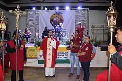 Nowadays, the celebration of the Palm Sunday, as well as the other celebrations, follow the rite promulgated by the Second Vatican Council, and begins at the windows of the Church of Our Lord of Bonfim. Upon arrival, the priest greets the people in the usual way, recites the prayers, and sprinkles the branches with holy water. The proclamation of the Gospel is made and then the procession is announced. At the beginning of the procession, immediately in front, goes the acolyte with the lighted thurible, and then, according to ancient local custom, the cruciferary, a Brother of the Blessed Sacrament with the ornamented cross; two Brothers leading the lanterns forming the wing of the faithful on the sides of the street in single line. In the center, the youth group of the Stations of the Cross Pastoral, followed by the guild of the Brotherhood of the Blessed Sacrament with the parish priest, accompanied by the Phoenix Band that performs the traditional dobrados and festive marches from its repertoire. When the priest arrives at the Mother Church, where the altar for the outdoor mass is located, he continues the celebration in the usual way, without the presence of the traditional choir and orchestra. On Palm Sunday evening and Holy Monday, the other celebrations of the Feast of the Steps take place.[42]