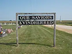 The cemetery is a rectangular parcel of land that measures 348 by 446 feet (106 by 136 m), and contains roughly 3.1 acres (1.3 ha).[3] The original section was deeded to the church in 1865, although the first burial was recorded in 1864. The earliest grave marker, however, dates from 1861. Several large cedar trees were located in the cemetery that marked it out from the farmland that surrounds the cemetery. It was originally surrounded by a steel fence with an entrance gateway. Above the gate was a sign that read "Kvindherred Cemetery". It was replaced by a wooden sign along the road in front of the cemetery that reads "Our Saviors Kvindherred". The cemetery is located 1,700 feet (520 m) north of the church along the same road.